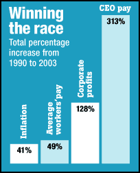 "I’m a little embarrassed about it." That’s what United Technologies Corp. CEO George David had to say about his paycheck for 2003 -- a cool $70.5 million. He should be embarrassed. But he won’t be alone. According to Business Week magazine’s annual review, paychecks for CEOs at the biggest U.S. corporations in 2003 were "off-the-charts amazing." Overall compensation--including salaries, bonuses and long-term compensation deals like stock options--for CEOs at the country’s 365 largest companies increased by an average of 9.1 percent last year, Business Week found. After two years of declining, the ratio that compares CEO pay to the wages of an average worker was on the rise again--climbing to 301 to 1. That’s down somewhat from the record heights set at the end of the 1990s "miracle economy" bubble. But the filthy rich bosses of Corporate America are still raking it in--thanks to skyrocketing overall compensation that, from 1990 to 2003, increased eight times faster than the rate inflation, more than six times faster than average workers’ pay, nearly three times faster than corporate profits and almost double the pace of the booming stock market.