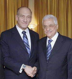 Palestinian president Mahmoud Abbas (R) grins after getting promise from Israeli prime minister Ehud Olmert (L) to partial release of illegally seized Palestinian tax funds. (Moshe Milner/GPO)