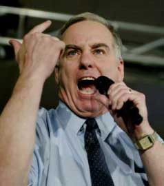 Dean looked like a mental patient on crystal meth: out of control, snarlingly screaming, vindictive (hollering that he’d beat Kerry in Massachusetts), verbally dispersed, his face contorted. He became the caricature of the angry, incautious wild man his opponents and the punditocracy had been decrying. This deranged performance, as one TV wag put it, meant it was no longer a question of whether you’d want this doctor in the White House, but whether you’d even want him in the emergency room. His candidacy cannot recover from this revealing, nationally televised, Nixonian moment. No wonder gentle George McGovern, a Wes Clark supporter, felt moved in a post-vote CNN appearance to pointedly underscore his "complete confidence in Clark’s emotional health."